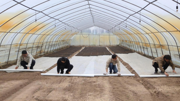 青年員工在育秧大棚內(nèi)鋪設(shè)無紡布