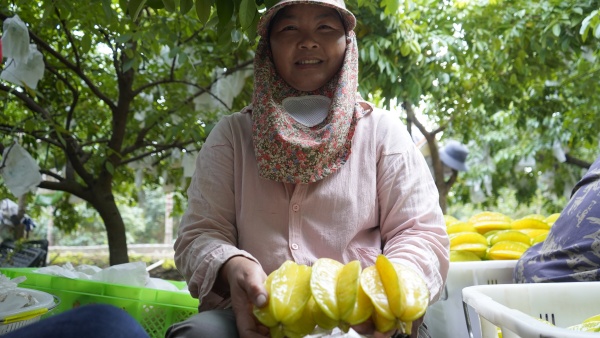 來自成都的旅居游客邱阿姨和同伴也被香甜誘人的楊桃吸引,直接進(jìn)到地里購買。“元江簡直是人間寶藏!水果又多又好。上次來那路村游玩,品嘗到黃澄澄的楊桃,就一直記著這個(gè)味道,這次就迫不及待直接來地里回購!這些楊桃?guī)Щ厝?,家里人肯定高興。”邱阿姨一邊說一邊挑選著楊桃。刀紹沙則幫顧客分揀、包裝好,并叮囑存放竅門。