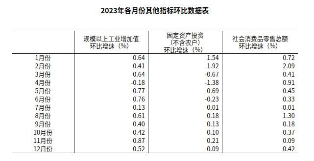 (2)根據(jù)季節(jié)調(diào)整模型自動(dòng)修正結(jié)果,對(duì)近一年來(lái)各期國(guó)內(nèi)生產(chǎn)總值、規(guī)模以上工業(yè)增加值、固定資產(chǎn)投資(不含農(nóng)戶)、社會(huì)消費(fèi)品零售總額環(huán)比增速進(jìn)行修訂。修訂結(jié)果及2023年四季度GDP環(huán)比數(shù)據(jù)、2023年12月份其他指標(biāo)環(huán)比數(shù)據(jù)如下:
