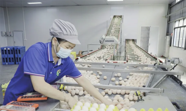 在雞蛋分揀車間,每一枚雞蛋都要經(jīng)過由丹麥進(jìn)口的賽諾沃生產(chǎn)線共12道工序才能達(dá)到出產(chǎn)的標(biāo)準(zhǔn)。次蛋光學(xué)篩選、食品級(jí)清洗、紫外線殺菌、裂紋聲波檢測(cè)、可食用白油覆膜、激光噴碼、全自裝箱……雞蛋自動(dòng)化生產(chǎn)流程一氣呵成?!叭ツ辍畯V墾鳳鮮’雞蛋通過NSF無抗生素認(rèn)證時(shí),審核員都不敢相信中國農(nóng)場(chǎng)能達(dá)到歐盟標(biāo)準(zhǔn)?!绷何暮曜院赖卣故局u蛋溯源系統(tǒng),掃碼可見每枚蛋產(chǎn)自哪棟雞舍、哪批飼料?!?