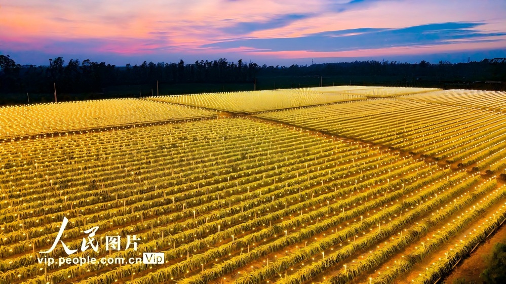 立冬時(shí)節(jié),北海市合浦縣石灣鎮(zhèn)清水村火龍果種植基地利用現(xiàn)代化科技在夜間給火龍果補(bǔ)光,促進(jìn)火龍果的光合作用,讓火龍果擁有良好的生長環(huán)境,進(jìn)一步提高火龍果產(chǎn)量,增加出果批次,助力果農(nóng)增產(chǎn)增收。林啟波攝(人民圖片網(wǎng))