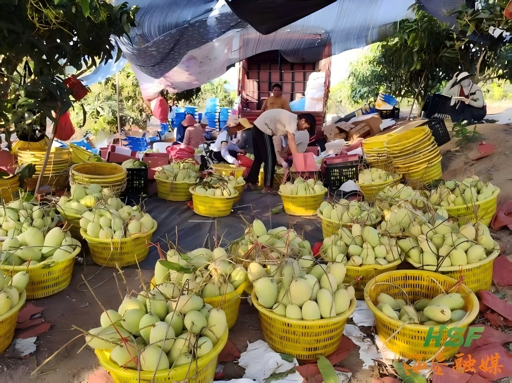 翠綠的芒果林碩果累累,六七名工人穿梭其間,順著枝頭逐一為芒果脫袋,隨后小心翼翼地把即將成熟的芒果采摘下來(lái),動(dòng)作嫻熟且細(xì)致,生怕?lián)p傷果實(shí)。不遠(yuǎn)處的基地作業(yè)區(qū)域,另一群工人正熟練地進(jìn)行著選果、打包、裝車作業(yè),大家動(dòng)作麻利,將一個(gè)個(gè)金黃飽滿的芒果精心分揀、規(guī)范裝箱和裝車外運(yùn),處處洋溢著豐收的喜悅。
