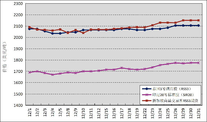 國(guó)外主產(chǎn)區(qū):12月,泰國(guó)3號(hào)煙片膠(RSS3)平均價(jià)格2071美元/噸,環(huán)比上漲23美元/噸,最高價(jià)2105美元/噸,最低價(jià)2035美元/噸;印尼20號(hào)標(biāo)準(zhǔn)膠(SIR20)平均價(jià)格1720美元/噸,環(huán)比上漲38美元/噸,最高價(jià)1775美元/噸,最低價(jià)1670美元/噸;新加坡商品交易所RSS3期貨主力合約月均結(jié)算價(jià)格2090美元/噸,環(huán)比上漲43美元/噸,最高價(jià)2150美元/噸,最低價(jià)2039美元/噸。