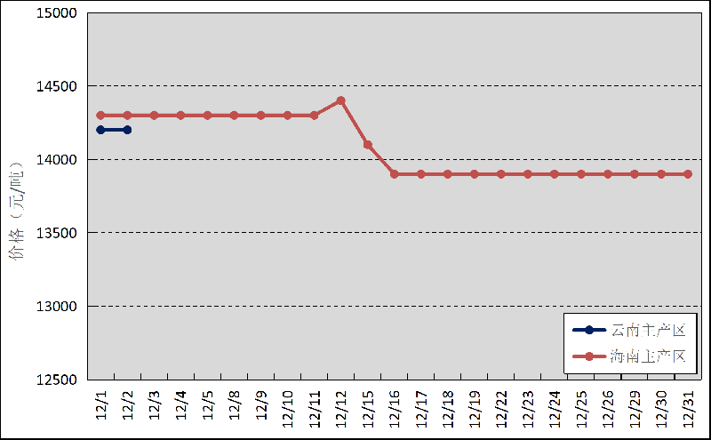 國(guó)內(nèi)主產(chǎn)區(qū):12月,云南產(chǎn)區(qū)全面停割,海南產(chǎn)區(qū)逐步停割。云南、海南鮮膠乳(折干膠)月均價(jià)格分別為14200元/噸、14087元/噸,分別環(huán)比上漲279元/噸、下跌192元/噸。
