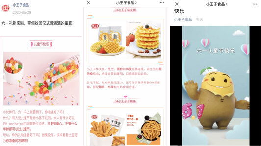 京糧控股所屬小王子以“‘六一’禮物來啦,帶你找回儀式感滿滿的童真”為主題,通過微信公眾號圖文并茂制作“土豆仔”攻略,推出兒時的經(jīng)典回味聰明棒、燒麥,新時代的王紅零食——非油炸更健康的“堅強(qiáng)的土豆片”多味禮盒,顆顆金黃立體、顏值炸裂、口口酥香薄脆的“嘣咔嚓咔嚓”四層玉米片,芝士、面粉、雞蛋完美碰撞誕生的超治愈系蛋糕“小王子華夫餅”,辣感十足、線位置就、好吃不干燥、嗨吃不油膩的“小王子干辣條”,通過這些精致的美味,喚起大家美好童年的回憶。