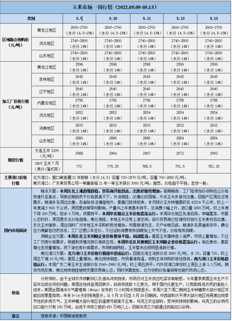 天然橡膠、大豆、玉米市場一周行情(2022.05.09-05.13)