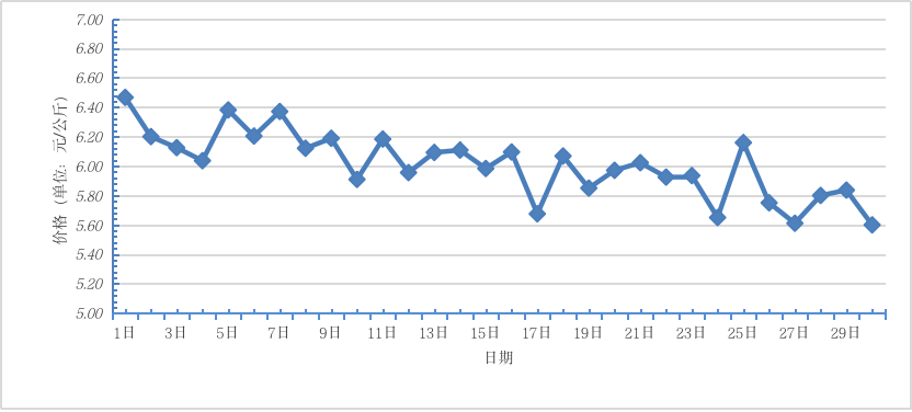 6月,全國重點(diǎn)監(jiān)測農(nóng)產(chǎn)品批發(fā)市場香蕉總交易量達(dá) 2.1萬噸,同比下降74.7%,環(huán)比上漲10.5%;總交易價值 14442.4萬元,同比下降62.7%,環(huán)比上漲5.0%。日平均價格最高為6.2元/千克,最低為5.6元/千克,全月平均價格為 6.0元/千克,同比上漲22.4%,環(huán)比下降10.4%(每日價格變化如圖)。