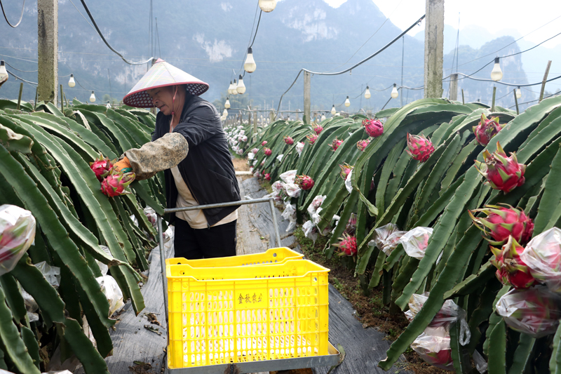 新春佳節(jié)臨近,位于大新縣桃城鎮(zhèn)寶賢村岜馬新屯的410畝火龍果基地迎來采收季,田間地頭、基地倉儲中心一派繁忙的景象。
