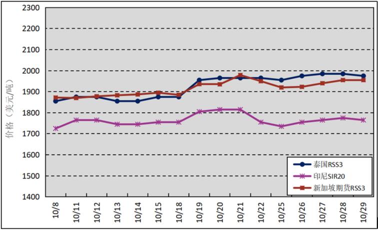 國外主產(chǎn)區(qū):10月,泰國RSS3平均價(jià)格為1924美元/噸,環(huán)比上漲95美元/噸,最高價(jià)為1985美元/噸,最低價(jià)為1855美元/噸;印尼SIR20平均價(jià)格為1765美元/噸,環(huán)比上漲107美元/噸,最高價(jià)為1815美元/噸,最低價(jià)為1725美元/噸;新加坡RSS3期貨主力合約月均結(jié)算價(jià)格為1916美元/噸,環(huán)比上漲128美元/噸,最高價(jià)為1979美元/噸,最低價(jià)為1870美元/噸。