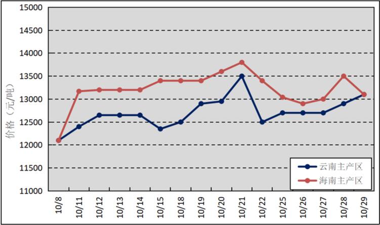 國內(nèi)主產(chǎn)區(qū):10月,我國天然橡膠主產(chǎn)區(qū)仍處于割膠旺季,但降雨較多、海南主產(chǎn)區(qū)遭受臺(tái)風(fēng)襲擊,割膠生產(chǎn)和橡膠產(chǎn)量受到一定影響。海南原料膠(折干膠)月均價(jià)格為13213元/噸,環(huán)比上漲1113元/噸;云南原料膠(折干膠)月均價(jià)格為12703元/噸,環(huán)比上漲932元/噸。