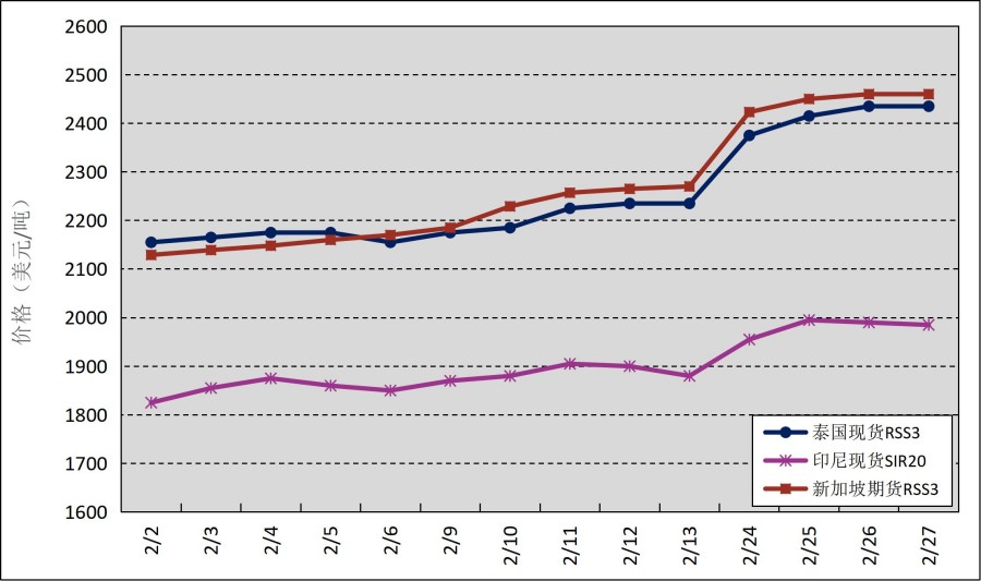 國外主產(chǎn)區(qū):2月,國外主產(chǎn)區(qū)價(jià)格呈上漲趨勢。其中,泰國3號(hào)煙片膠(RSS3)平均價(jià)格2253美元/噸,環(huán)比增加102美元/噸,最高價(jià)2435美元/噸,最低價(jià)2155美元/噸;印尼20號(hào)標(biāo)準(zhǔn)膠(SIR20)平均價(jià)格1902美元/噸,環(huán)比增加82美元/噸,最高價(jià)1995美元/噸,最低價(jià)1825美元/噸。
