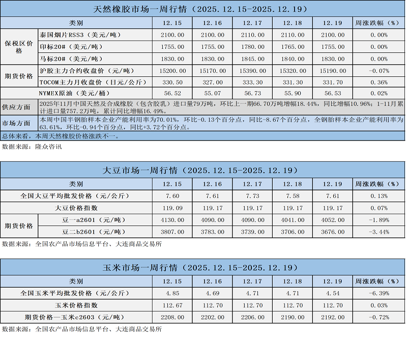 天然橡膠、大豆、玉米市場一周行情(2025.12.15-12.19)