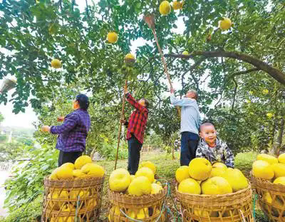 重慶市墊江縣黃沙鎮(zhèn)長紅社區(qū),村民在收獲柚子。 龔長浩攝(人民視覺)